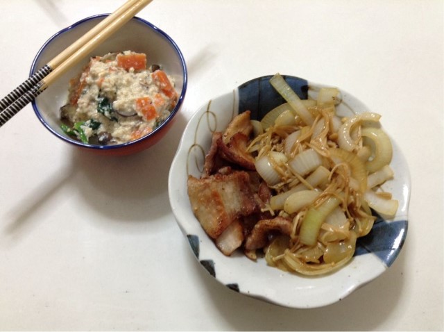 昼食:豚バラ焼き&玉ねぎとエノキのオイラード炒め&ほうれん草の白和え 糖質15gくらい