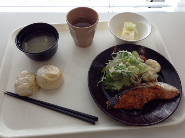 昼食:塩鮭のグリル ジンジャーソース定食+ファイバー蒸しパン 糖質14gくらい