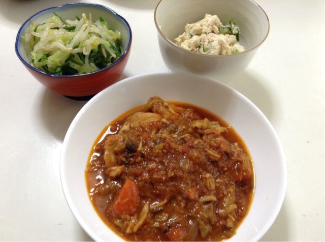 昨夜の残りのしちゅーと、冷蔵庫に入っていたきゅうりを消費しまくりの副菜。