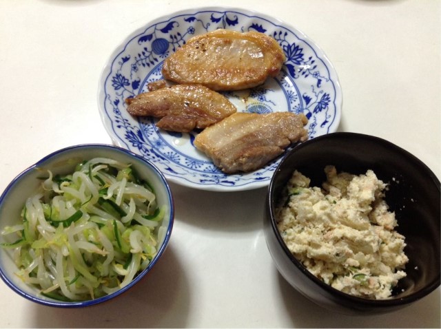 夕食:豚肉のソテー(肩ロース&バラ)+ナムル。おからサラダは食べ切れませんでしたorz 糖質5g行かないはず。