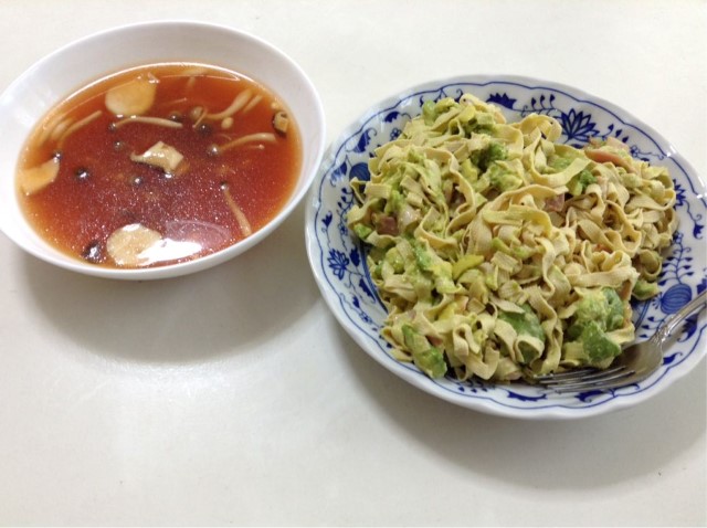 アボカドのカルボナーラ by koro蔵+トマト缶汁のキノココンソメスープ 糖質15gくらい