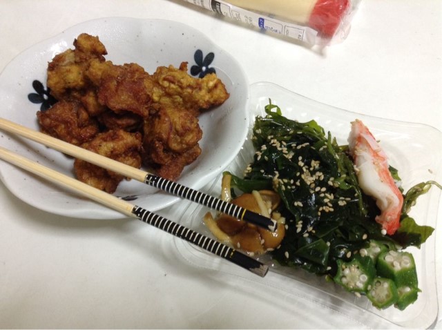 駅前の惣菜屋の唐揚げと、同じく駅前のコンビニで買ったサラダです。