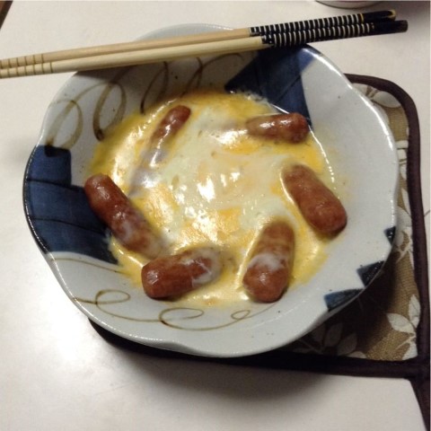 朝食:ウインナーの巣篭もりたまご チーズがけ 糖質6gくらい