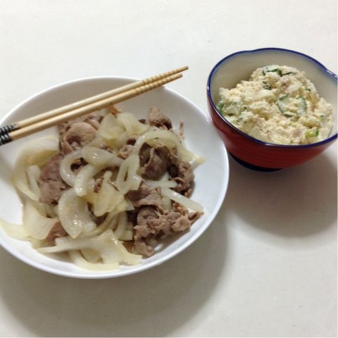 夕食:豚肉と新たまねぎの炒め物&おからサラダ 糖質20gくらい