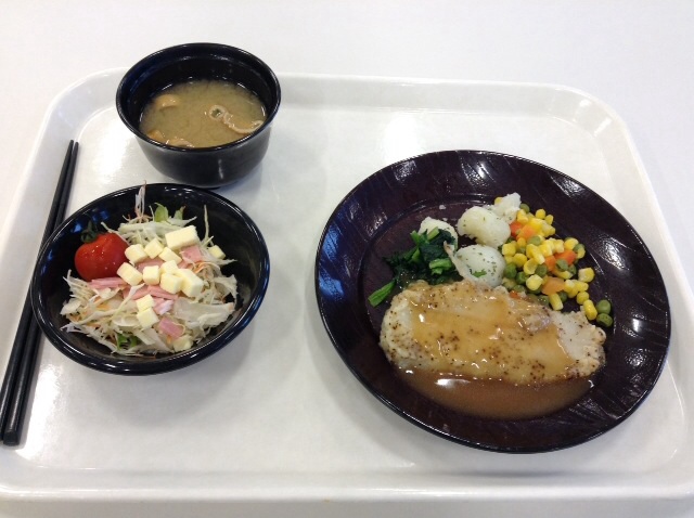昼食:舌平目のムニエル ポテトコーン残し&ハムチーズサラダ 糖質18gくらい