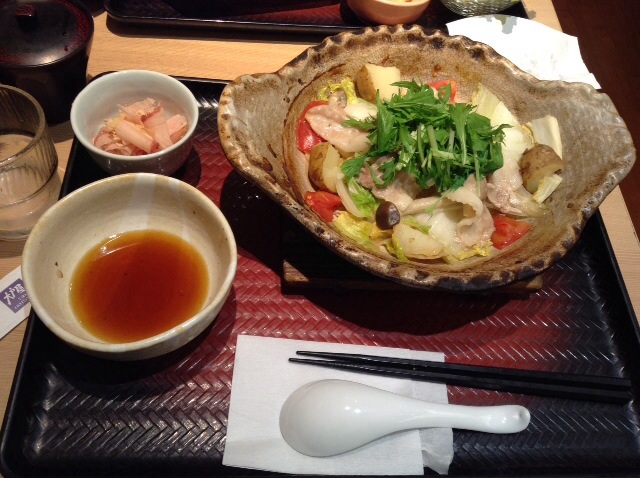 夕食:豚肉と野菜の蒸し鍋(大戸屋)&豆腐と鰹節のサラダ 糖質20g未満