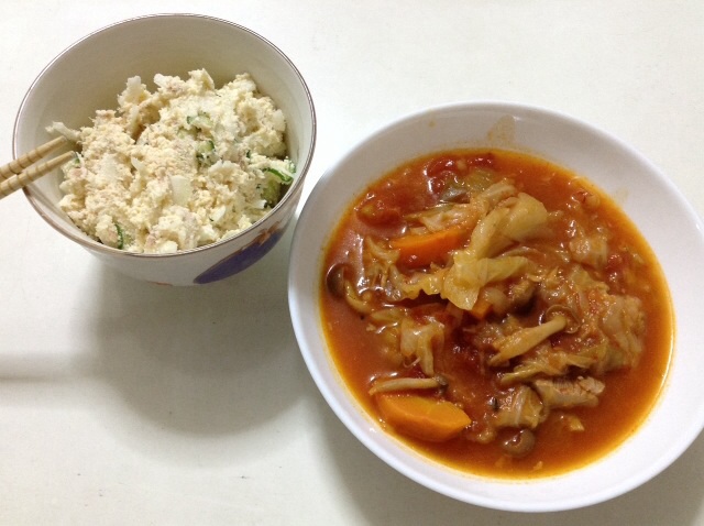 夕食:チキンのトマトシチュー&おからサラダ 糖質15gくらい