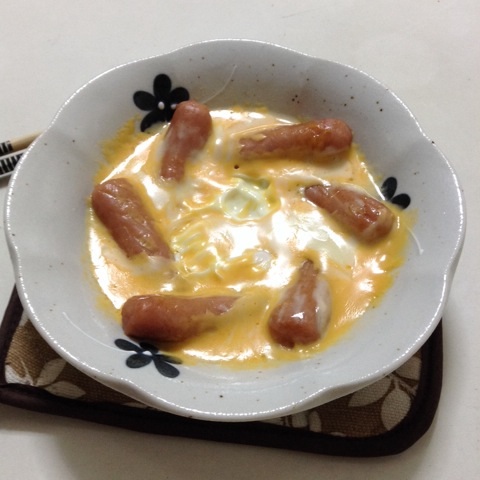 朝食:ウインナーの巣篭もり卵 チーズのっけ 糖質6gくらい