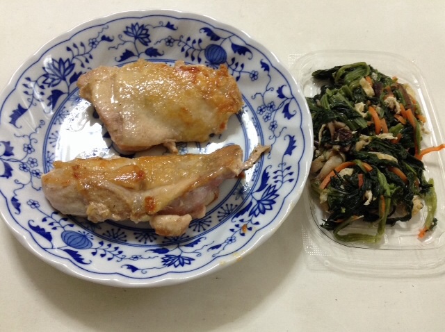 昼食:鶏ももソテー&ほうれん草のおひたし(西友) 糖質7gくらい