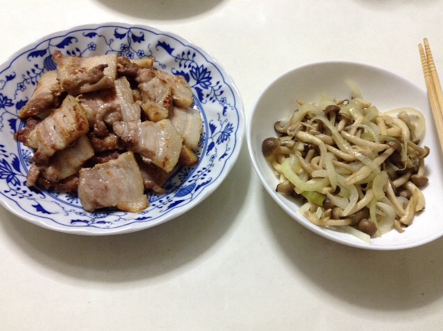 夕食:豚バラ焼き&玉ねぎとキノコの炒め物 糖質9gくらい