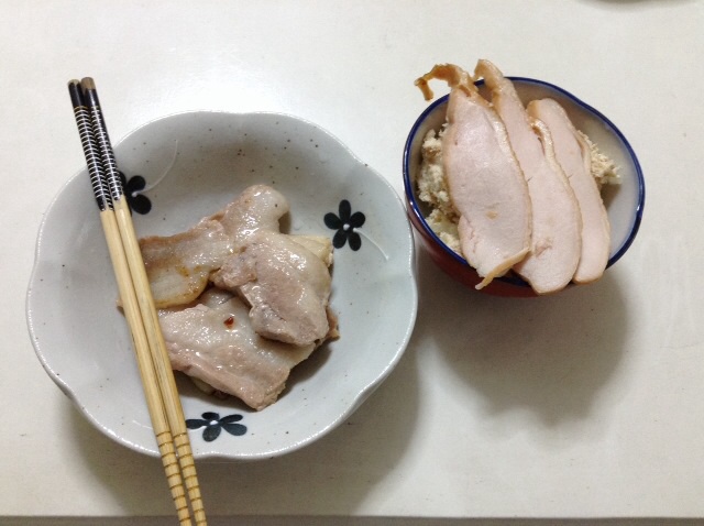 昼食:豚バラ焼肉&おからサラダ スモークチキンのっけ 糖質3gくらい