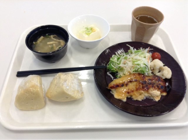 昼食:社食(ホキの味噌マヨ焼き定食・ごはん抜き)+オート小麦ファイバー蒸しパン 糖質14gくらい
