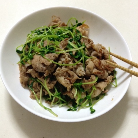 夕食:豆苗と豚バラのニンニク醤油炒め 糖質5gくらい