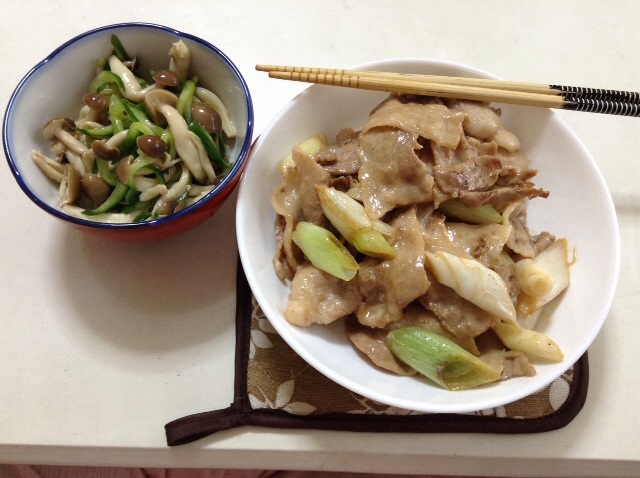昼食:豚バラとネギのオイマヨ炒め&しめじとキュウリのナムル 糖質3gくらい