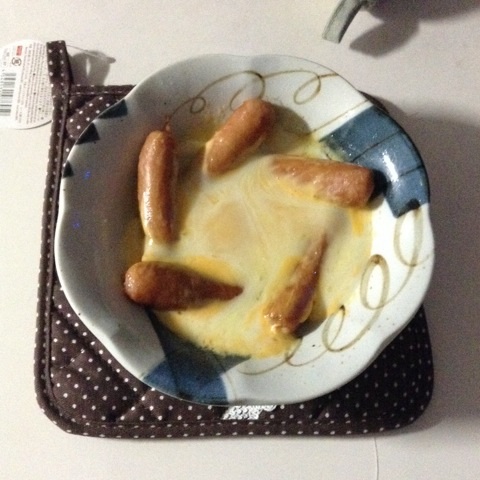 朝食:ウインナーの巣篭もり卵 チーズのっけ 相方さん作 糖質6gくらい