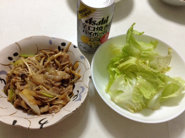 夕食:肉野菜炒め&レタスのサラダ&焼酎ハイボール 糖質20g未満だって信じてます☆