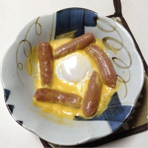 朝食:ウインナーの巣篭もり卵+チェダーチーズ 糖質3gくらい