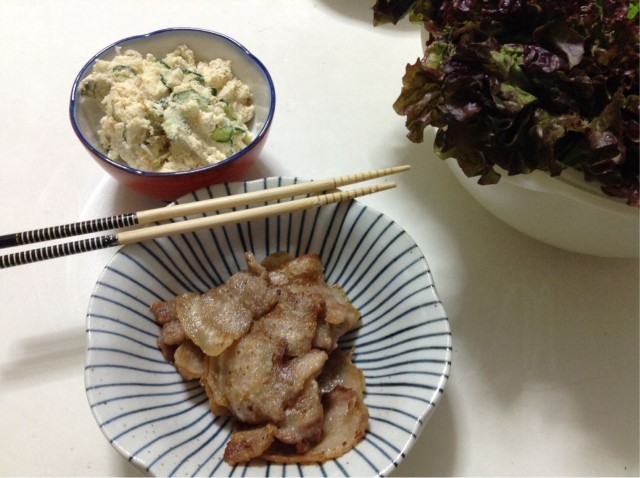 夕食:豚バラ焼肉のサニーレタス巻き&おからサラダ&野菜炒め 糖質18gくらい