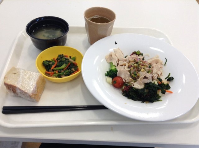 昼食:豚肉と野菜の柚子胡椒だれ定食+生おからパン 糖質20gくらいのはず