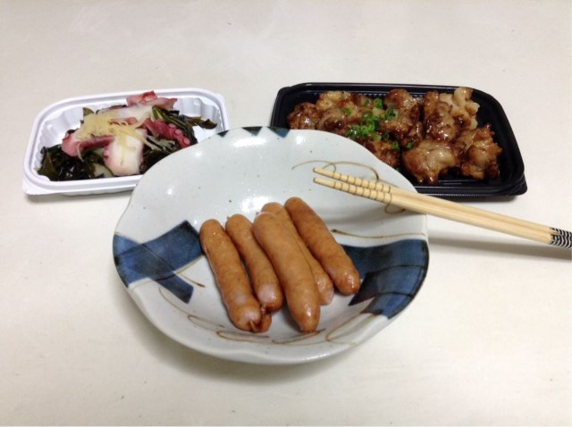 夕食:お惣菜(ネギ塩チキン+ワカメとタコの酢の物)+ウインナー(糖質ゼロ) 糖質5gくらい