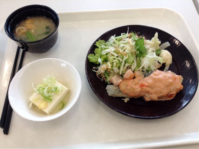 昼食:社食(ホキの味噌マヨ焼き定食・ごはん抜き)+オート小麦ファイバー蒸しパン 糖質14gくらい