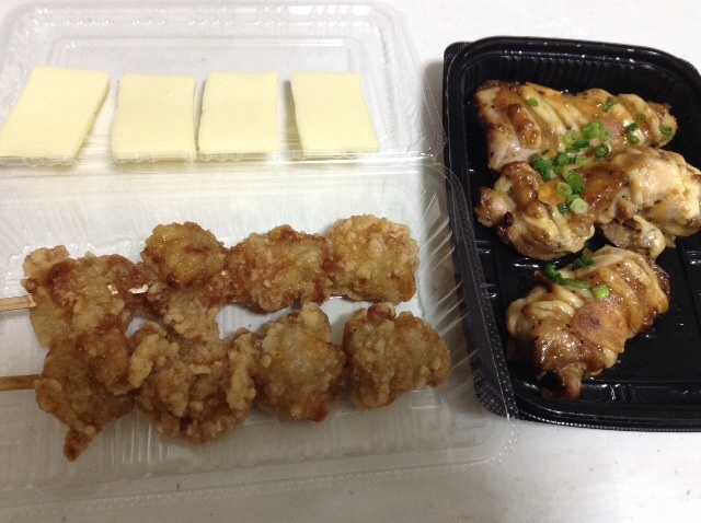 夕食:チーズ、ガーリックチキン、竜田揚げ串