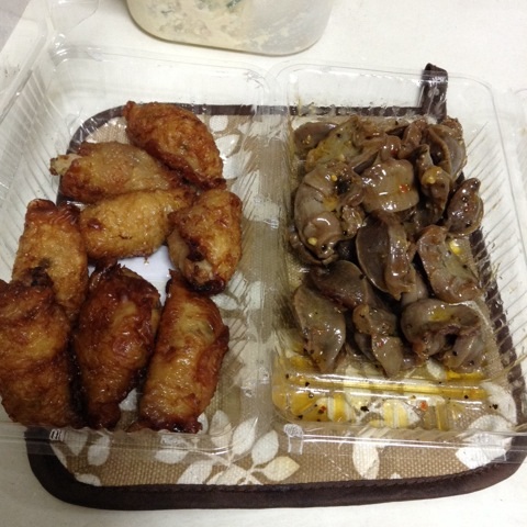 夕食:鶏皮餃子、砂肝のレモンペッパー炒め